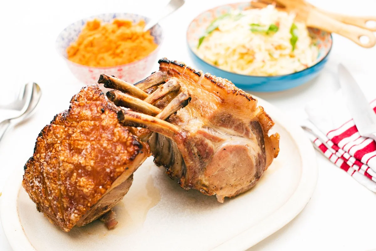 Dry Brined Pork Rack, Ginger Sweet Potatoes and Tangy Slaw