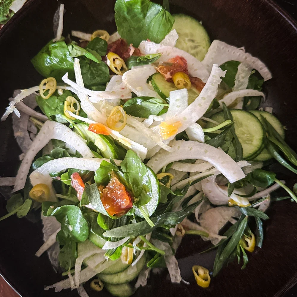 The salad is great as it is. It can also be used as a topping over wedges of lettuce or mixed with warm potatoes. If you want to use up all the vegetable ingredients, I keep the watercress aside, and dress the fennel, herbs, and cucumber with good-quality wine or sherry vinegar and salt; these last a week, and over time soften into a pickle. I mix in fresh greens and dress with olive oil when serving.